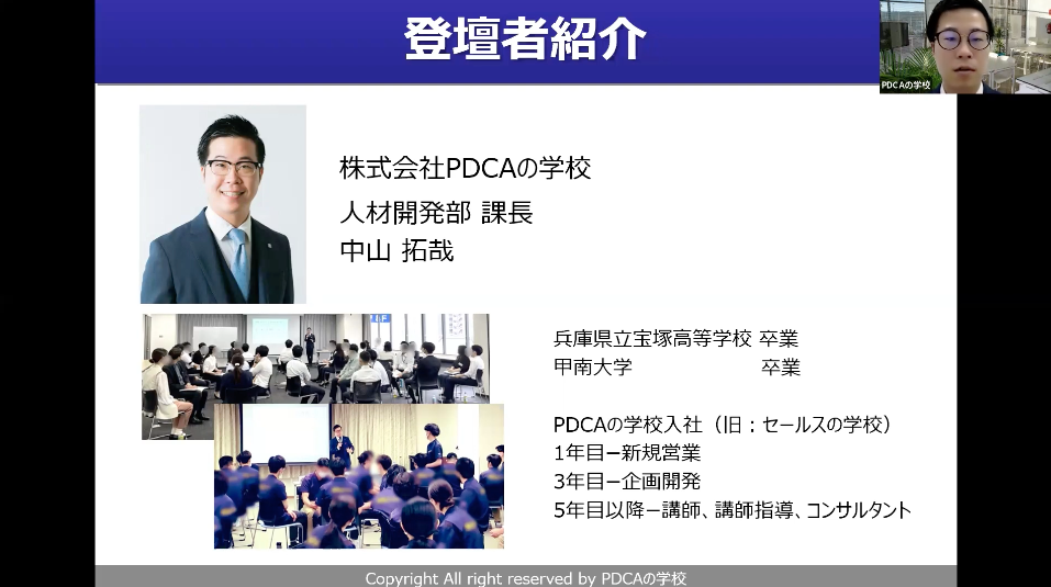 中山拓哉氏:定刻になりましたので、Webセミナーを始めてまいります。みなさん、こんにちは。本日担当いたします、株式会社PDCAの学校の中山と申します。どうぞよろしくお願いいたします。