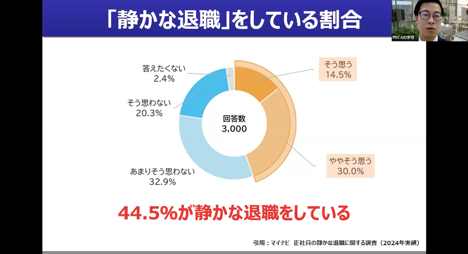 一応(静かな退職の定義について)読み上げておきますが、仕事への熱意とか積極性を失ってしまっている。要は、「必要最低限の業務でいいかな」という働き方をされていることを静かな退職と言います。