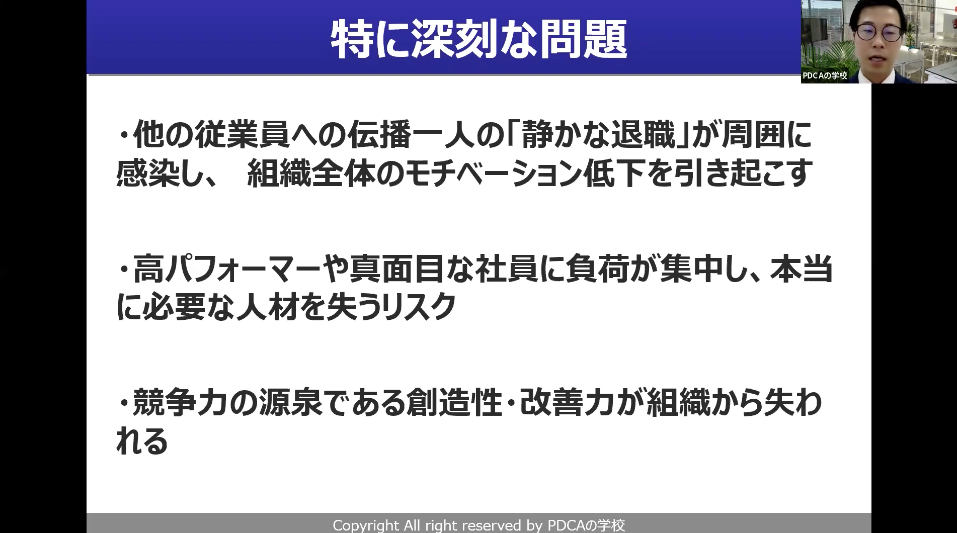 一生懸命がんばっている社員が、実際にそういった働き方をしている社員を見て、「あれでも自分と評価が変わらないなら、自分もあのレベルでいいかな」というふうに、静かな退職がどんどん伝染していくことは懸念点としても挙げられるかと思います。