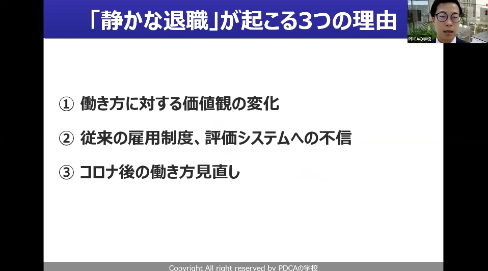 3つ目は、コロナ後にはけっこう自由とまでは言わないですけれども、テレワークとか自分なりの働き方が許容されやすい時代にもなってきましたので、そういったところも静かな退職の原因として挙げられるかと思います。