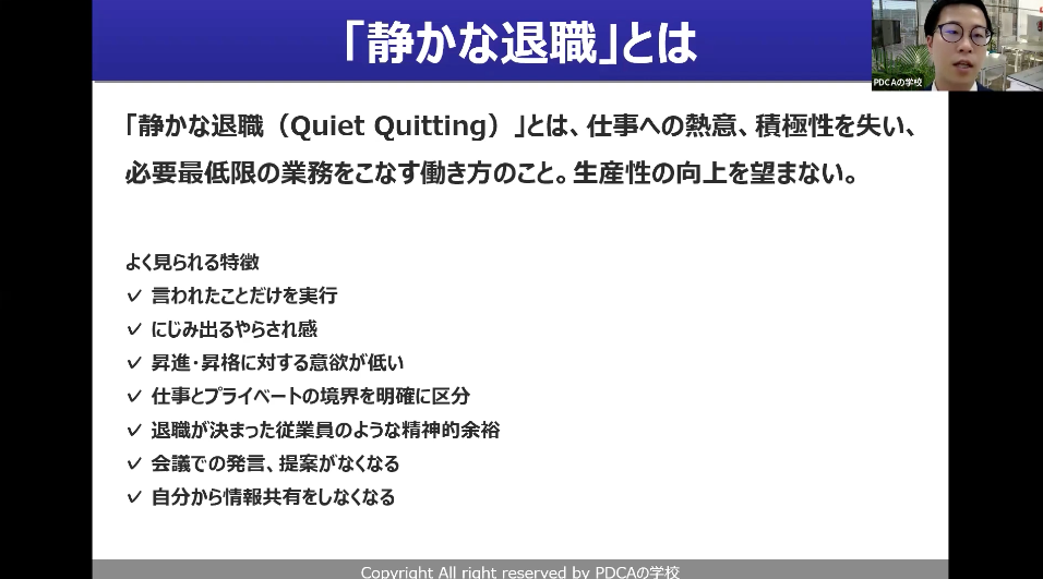 退職が決まった従業員のような精神的余裕があったりとか、会議の発言、提案、アイデア出しがなくなったり、率先した情報共有がなくなるといったところが特徴でございます。難しいところが、これは静かな退職をしているからこういう特徴が出ているのか、そもそも本人の価値観がそうなのか。