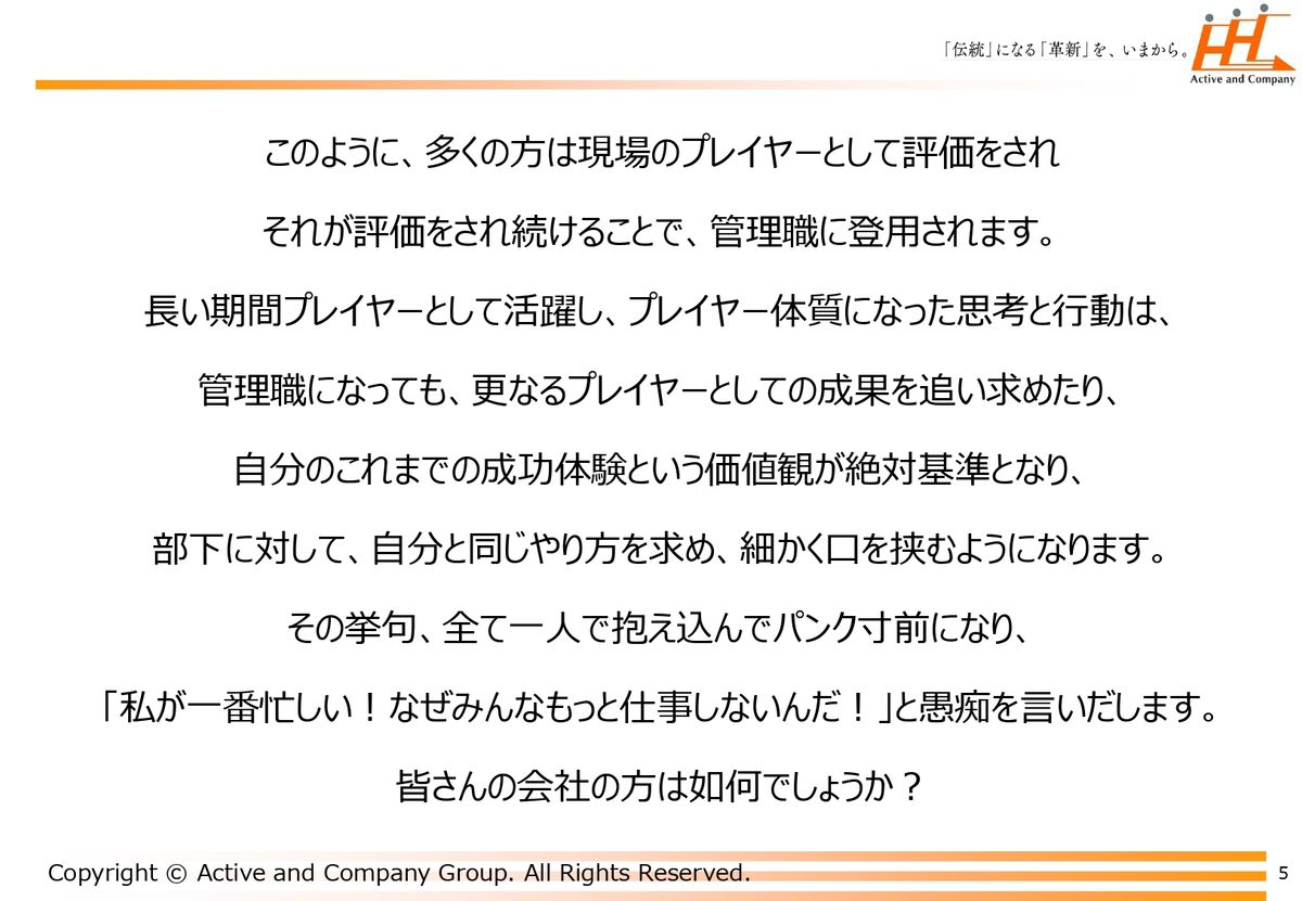 多くの方が現場のプレイヤーとして評価され、評価され続けることで管理職に登用される。ただそうすることで長い間プレイヤーとして活躍するので、プレイヤー体質の思考と行動になってしまいます。