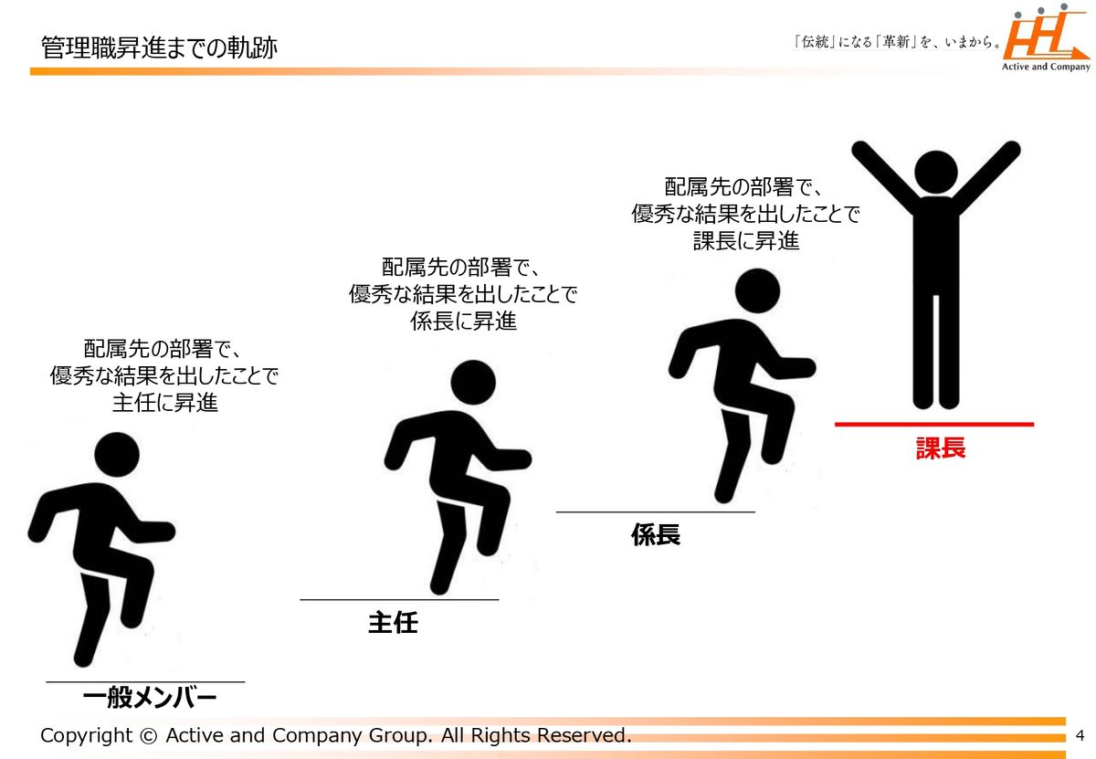 (スライドを示して)次の図をご覧ください。一般メンバーから主任に上がる時、どうやって上がっていくのか。配属先の部署で優秀な結果を出したことで、主任に昇進すると思います。