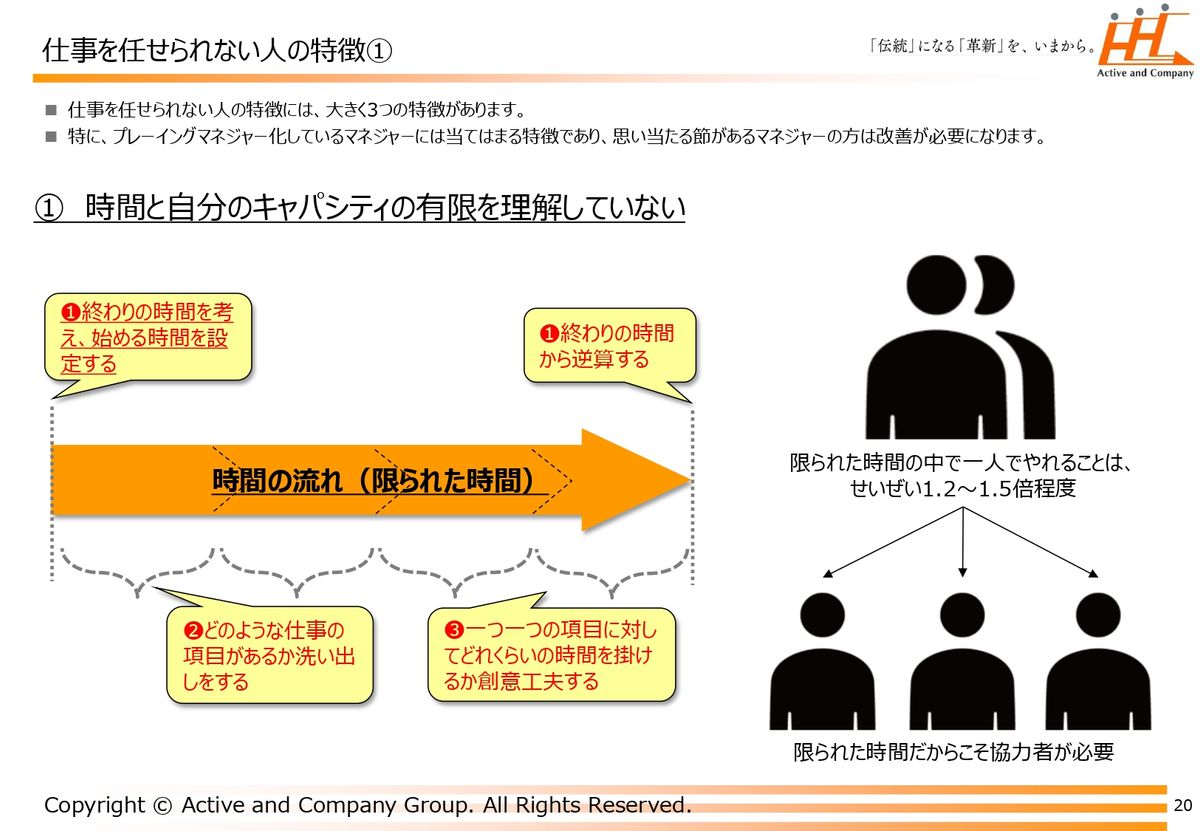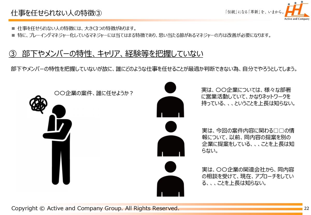 この3つの特徴がありましたが、みなさんもしっかりこれを見ていただきながら、何個当てはまったかを考えていただいて。ちょっと多く当てはまってしまった人は、この考えを脱却していただいて、まずは部下の特性を知るところから始めていただいてもけっこうだと思いますが、何かしら「任せられない特徴」を打開をするようなところを見つけていただければと思います。