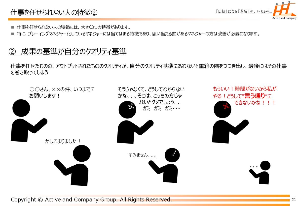続いて2つ目です。先ほど最初のところでも話したように、特にプレイングマネージャーをしている人は自分の基準が絶対基準になってしまうので、アウトプットされたもののクオリティができていないと、「どうして? そうじゃなくて……。ガミガミ、ガミガミ」っていうふうな話になってしまって。