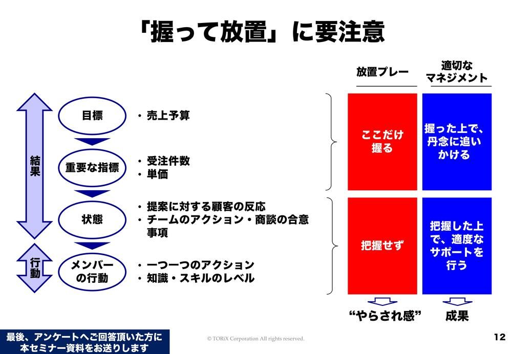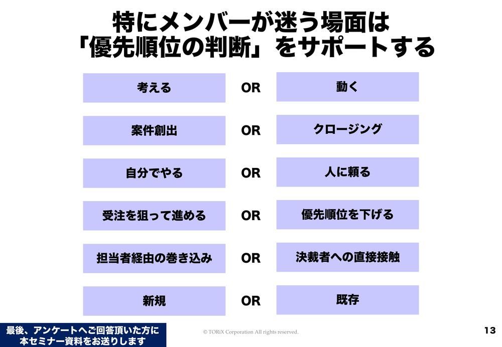 ただ、事実はむしろ逆で、メンバーがしっかりと再現性高く成果を上げていくために大変なのは、やはりマネージャーなわけです。ただし、マネージャーにも時間の限界があります。そこでどこに注目していくかなんですが、メンバーの優先順位の判断をサポートしてあげる必要があるということなんです。