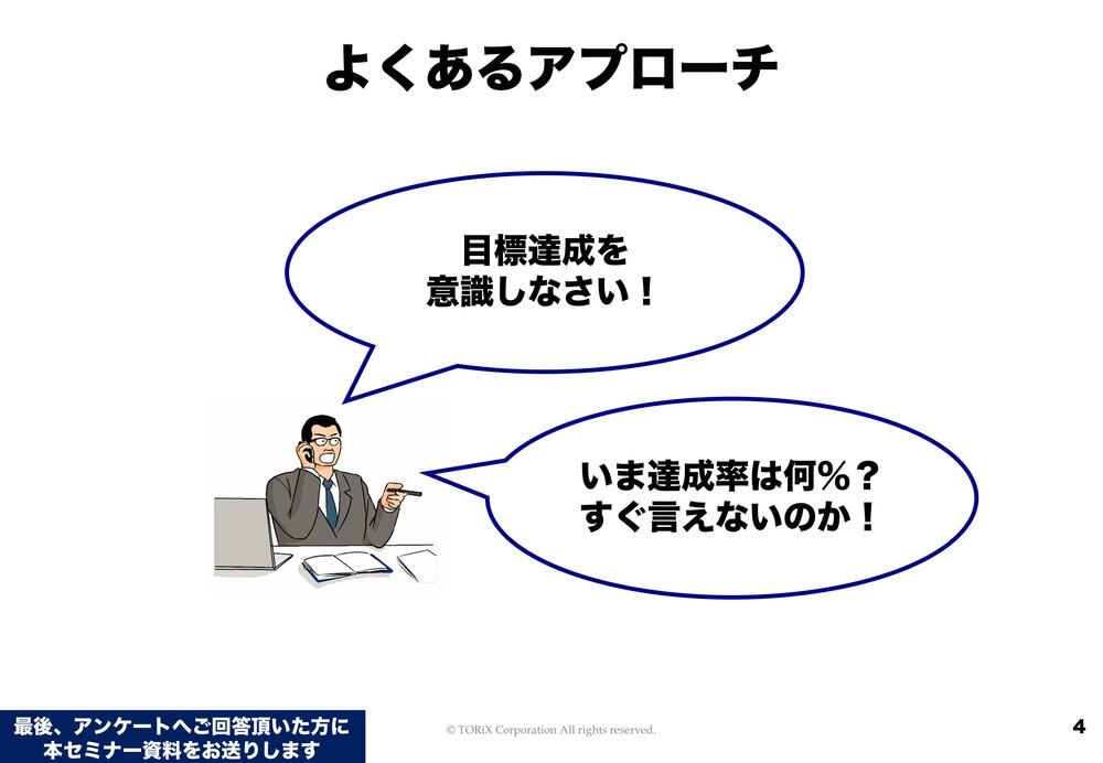 世の中でよくあるアプローチはどういうものか? ということなんですが、よくあるものはこんな感じかと思います。「今、目標は何パーセントだ?」みたいな感じで、達成意識を啓蒙するというアプローチです。
