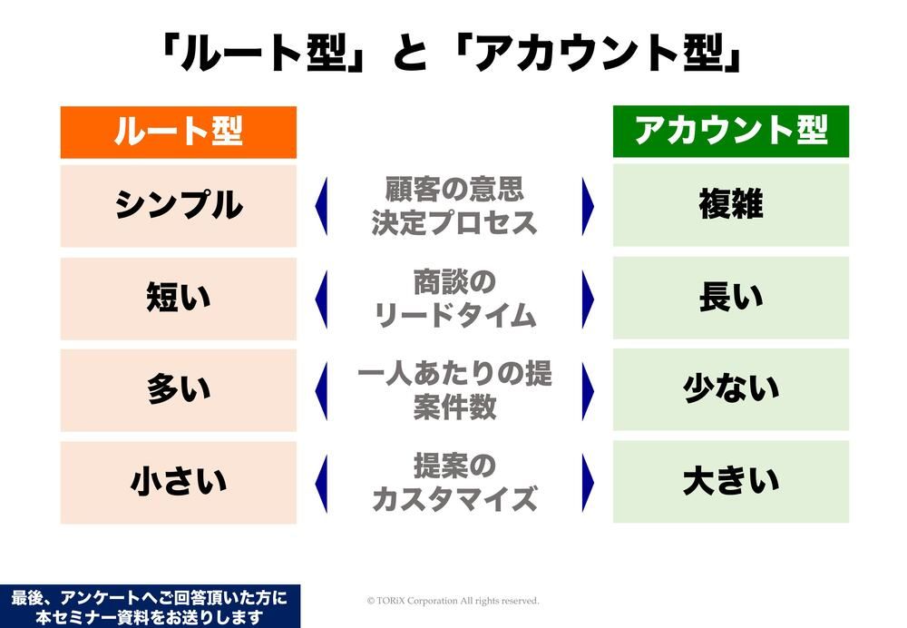 「ルート型」というのは、シンプルな決定プロセスで短い商談をたくさんやっていくようなタイプ。「アカウント型」というのは、1件1件が複雑で商談も長期にわたります。1人当たりはそんなにたくさんの提案件数を持てませんので、カスタマイズをわりと大きくやっていきます。