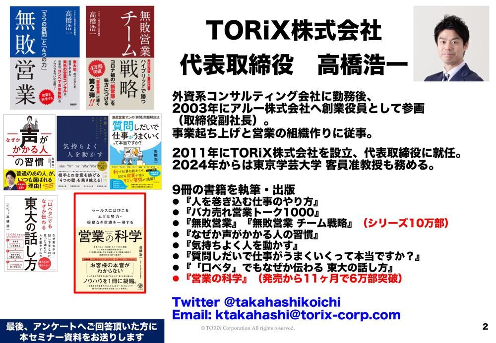 初めましての方もいらっしゃると思いますので、最初に簡単な自己紹介をさせていただきます。営業の研修やコンサルティングの会社を経営しているTORiX株式会社の代表を務めております、高橋浩一と申します。