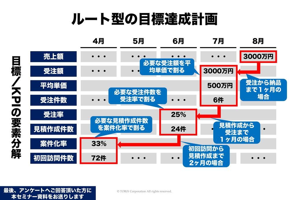 (売上額を)いくら達成する必要があったら、どのくらい受注しなくちゃいけないのか。平均単価がいくらだとすると、何件の受注が必要か。この受注をするためには、何件の見積もりを出しておかなくてはいけない。この見積もりを出すためには、この時点でこのぐらいのアポイントを取っておかなくちゃいけない。このようにルート型の目標達成計画というのは、逆算方式の計算で導き出されます。