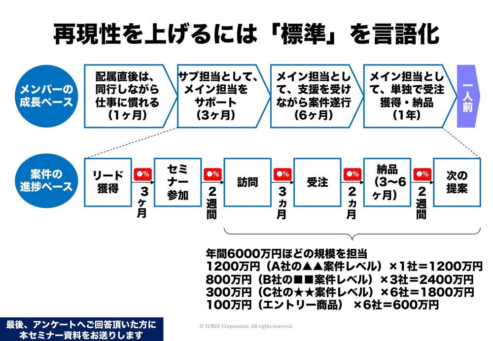 例えば(スライドを指しながら)これは一人前になるまでのスケジュール感です。案件の進捗ペースとして、リードの獲得からセミナー参加、訪問、受注、納品、次の提案となるような、おおよそのコンバージョンだったりスケジュール。そして、1人の営業担当がどのくらいの案件を持っているのか。