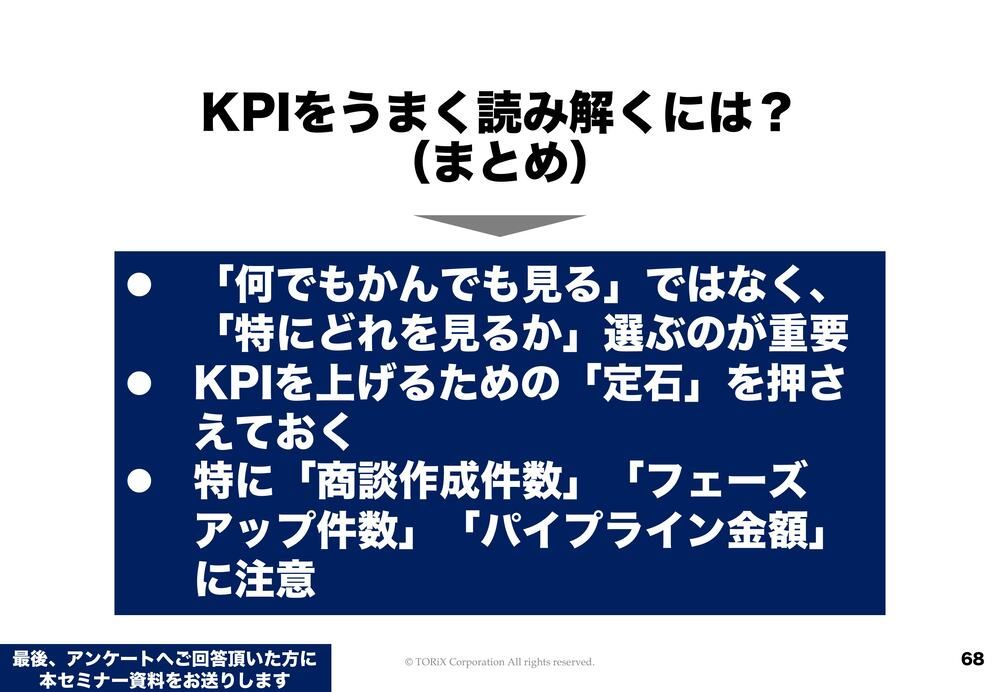 KPIを上げていくためには定石がありまして、行動の量を増やすか質を上げることです。この定石は押さえましょうという話をしました。特にKPIとしては、商談の作成件数、フェーズアップの件数、パイプラインの金額を見落とさないように注意しましょう。