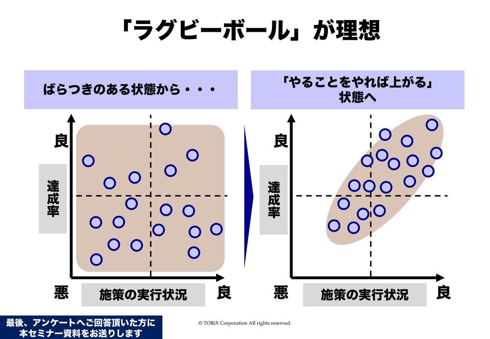 ラグビーボールの状態が作れていると、ちゃんとやっている人は成果が出ているよねという状態です。やることをやれば上がる状態を作りましょう。