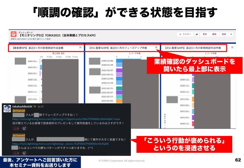 当社の場合は、受注報告よりも商談のフェーズアップのほうがピックアップして褒められやすいところがあります。「案件を作っているか」と「案件を進めているか」ということがすごく大事だということなんですね。もちろん別に受注が褒められないわけじゃないんですけれども、案件を作る行為と案件を進める行為が非常に尊いということです。