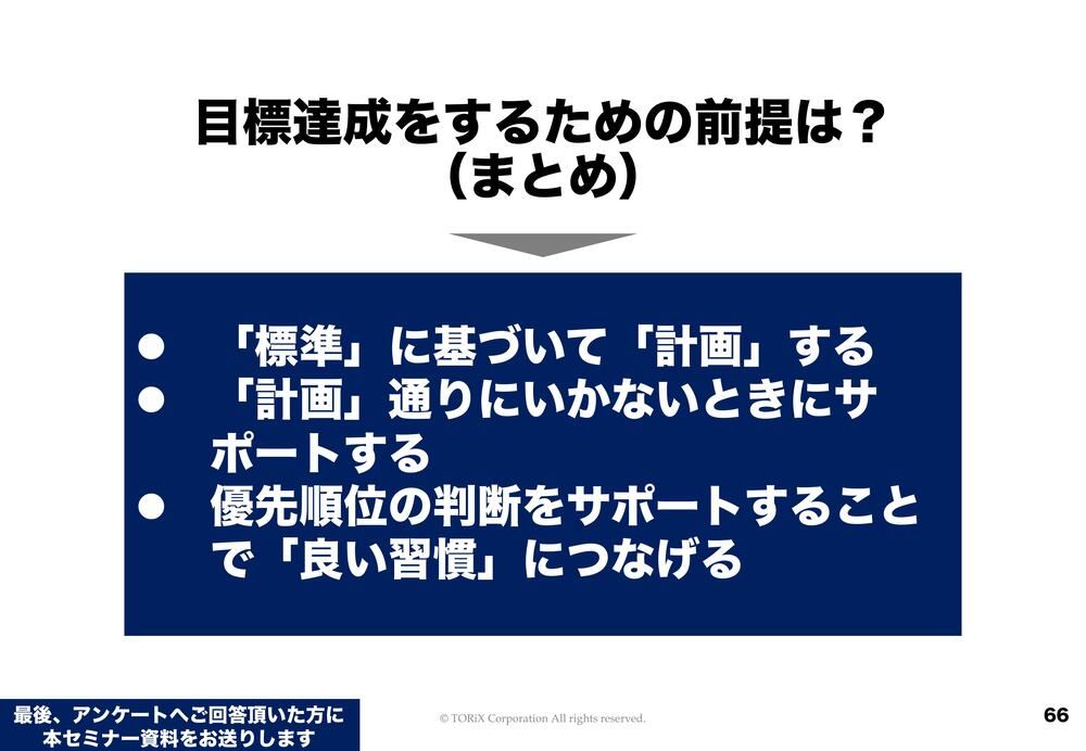 特に優先順位の判断を間違えないように、計画どおりにいかない時にはサポート。「目標達成を意識しなさい」って言うだけだと、なかなか現状は変わらないことになります。
