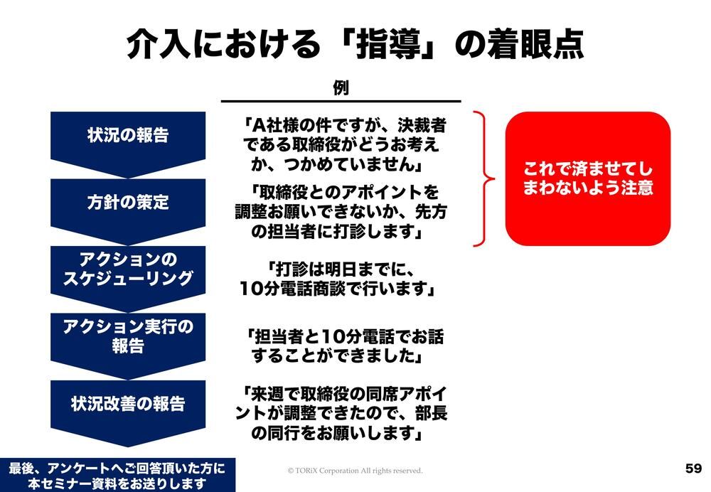 介入の時には、「今、どうなっているの?」「何をどういうふうにやるつもりなの?」というふうに報告させるじゃないですか。この時に、状況の報告をさせて方針の策定まで出させていたら、この先が必要なんですよね。いつアクションをする予定で、それはちゃんとやったのか、やっていないのか。そのあとで、どうなっているのかをちゃんと追いかけるということです。