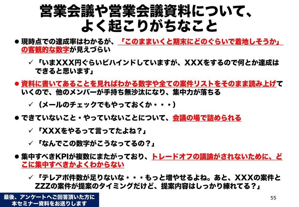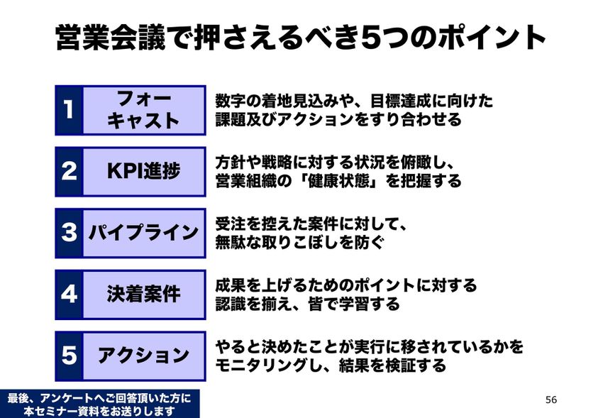 (3つ目が)パイプラインを見て、ちゃんとこのパイプラインを成就しようとする。(4つ目が)決着案件。これは意外となおざりになりがちなんですが、要するに最近の案件からの振り返りをするということですね。成果を上げるためのポイントに対する認識をそろえて、みんなで学習する。