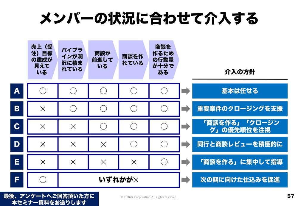 この(Eの)メンバーに関しては、さっきのDゾーンみたいなもんですよね。商談も作れなかったら、商談を作るところに集中して指導する。そして(Fのメンバーは)今期は見えているんだけど、その後のいずれかが足りていないという場合は、未来の話をしましょう。