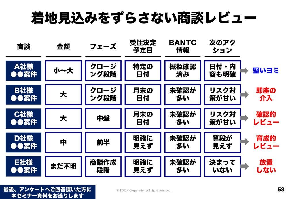 その案件を見ていった時に、クロージング段階まで来て「いついつに受注です」ということがはっきり見えていて、BANTC情報を確認済みです、次のアクションも明確です、というのはいいですよね。堅い「ヨミ」であるということです。