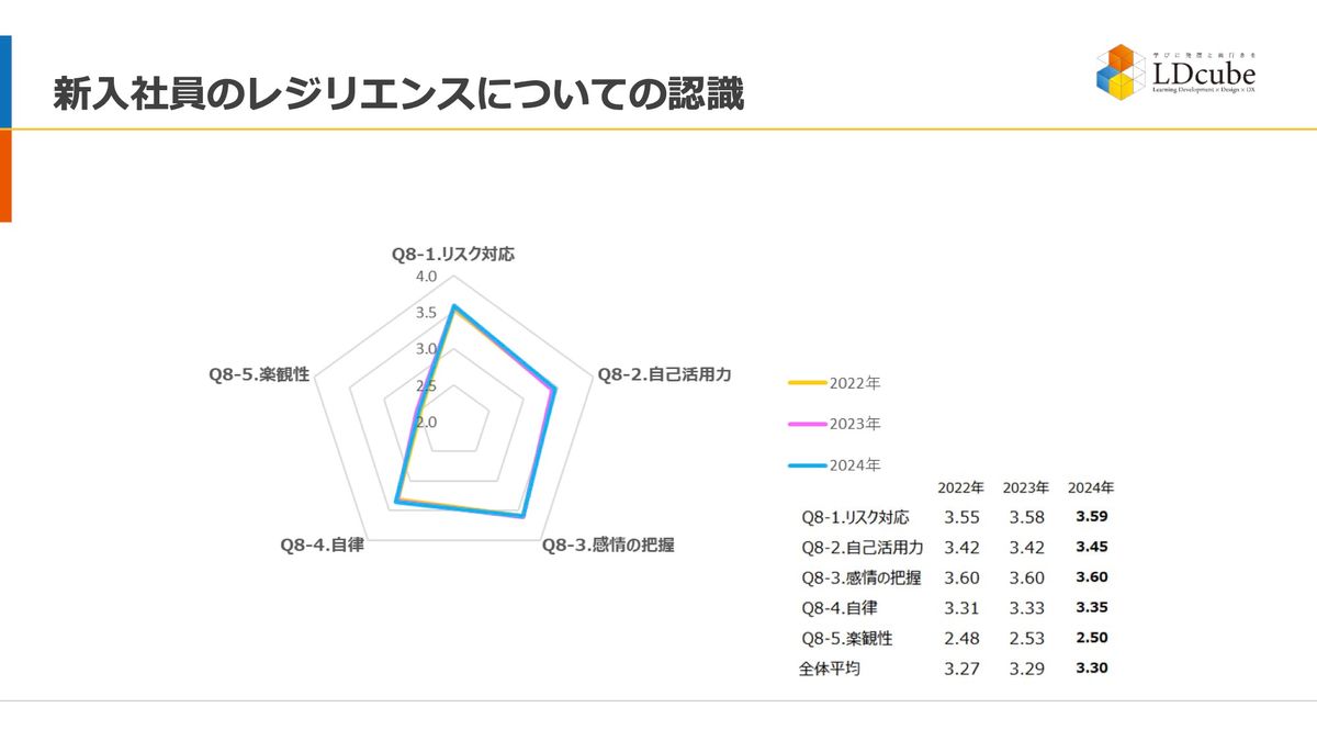 今回は、レジリエンスに関する部分について、ご紹介をさせていただきます。新入社員のレジリエンスについての認識ですけれども、恐らく予想どおりな部分もあるんじゃないかなと思います。過去3年間の傾向を見ていただいても、それほど(新入社員のレジリエンスが)高い傾向は出ていません。