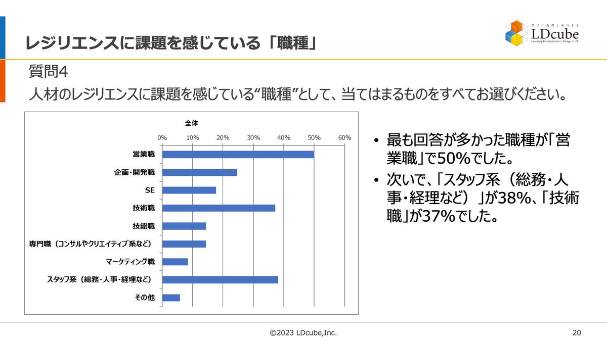 続いて、「レジリエンスに課題を感じている職種はどこなのですか?」。一番多かったのは営業職ですね。お客さま相手の商売ですので、やはり気持ちの切り替えが大事になってくるんじゃないかなと、人材開発部門のご担当者の方々は思っていらっしゃるかなと思います。