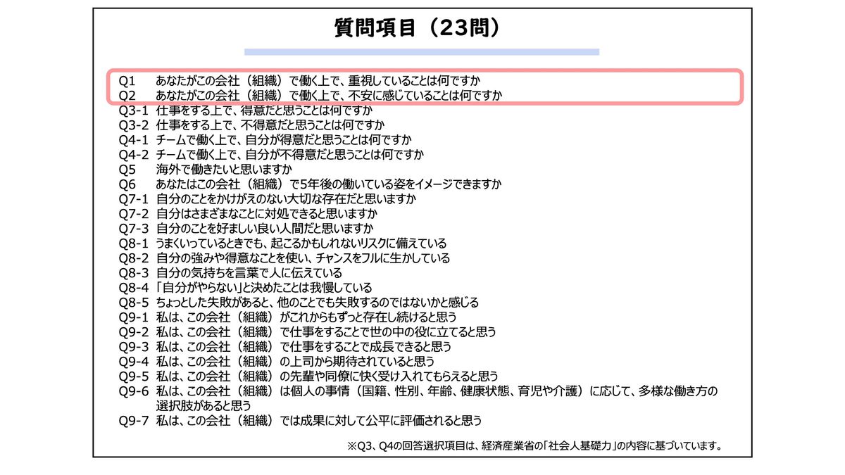 どういったことを聞いているかといいますと、実際に働く上で重視していることですとか、不安に感じていること。そして、仕事をする上で得意なこと、将来のキャリアビジョン。その他、自己・自尊感情について、レジリエンスについて。あとは、エンゲージメントについてといった観点で、23項目の質問をしております。