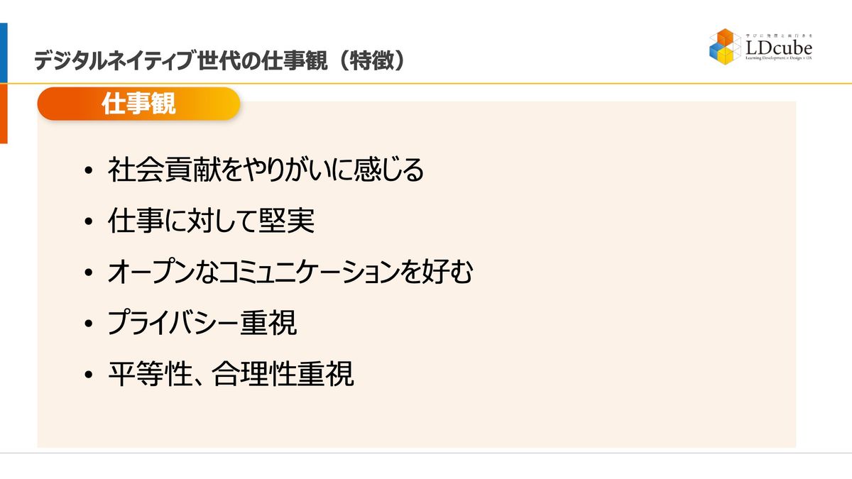 もう1つ、こんな観点からもご紹介させていただきます。仕事について、どんなことを思っているのかなという「デジタルネイティブ世代の仕事観」です。バブルが崩壊した後の氷河期の世代なんですけれども、その入社当時と比べると、だいぶ変わってきた印象はありますね。