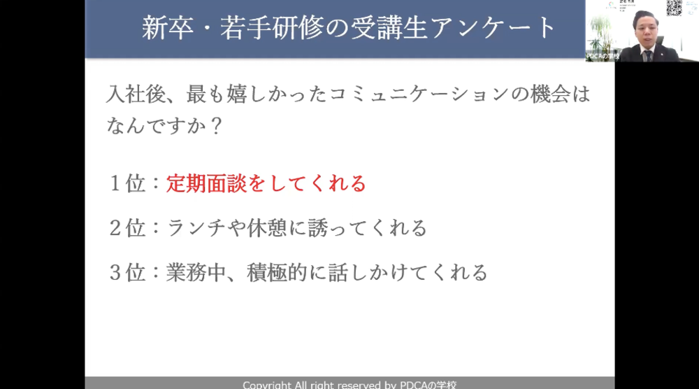 弊社でも新入社員・若手研修を毎年実施させていただいている中で、「入社後、最もうれしかったコミュニケーションの機会は何ですか?」という匿名アンケートをよくやらせていただいています。そこで挙がってくるのが、やはり「定期面談をしてくれる」なんですね。