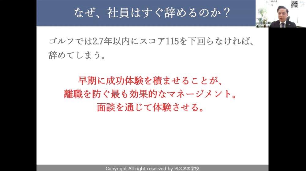 離職が問題になられている企業さまの多くでは、こういったことが言えるのかなと思っています。ゴルフが例え話になっているのですが、いわゆる成功体験を積むことができていない。弊社の代表なんかもよくゴルフへ行っていたりもするのですが、どうやらゴルフを始めてから2年7ヶ月以内にスコアが115を下回らなければ、辞めてしまうというデータがあるみたいです。