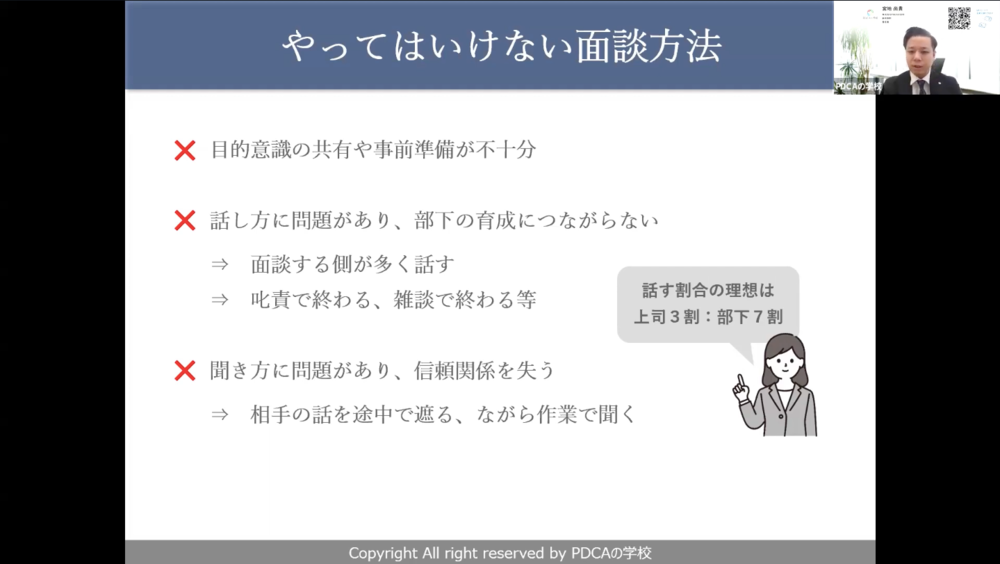 例えば、目的意識の共有や事前準備が不足している。もう1つが、話し方に問題があり部下の育成につながらない。面談をする側が多く話してしまうとか、叱責・雑談のみで終わると、「何の面談だったんだ? 怒られて終わったぞ」ということになる。