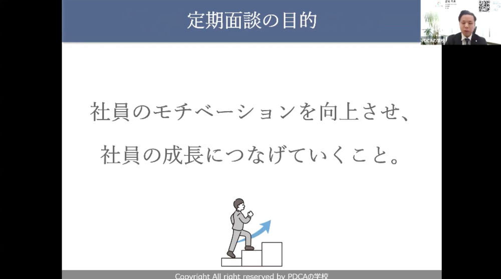 ちょっと脱線してしまいましたが、定期面談の目的をお伝えしたいなと思っています。基本的には、社員のモチベーションを向上させる、社員の成長につなげていく。