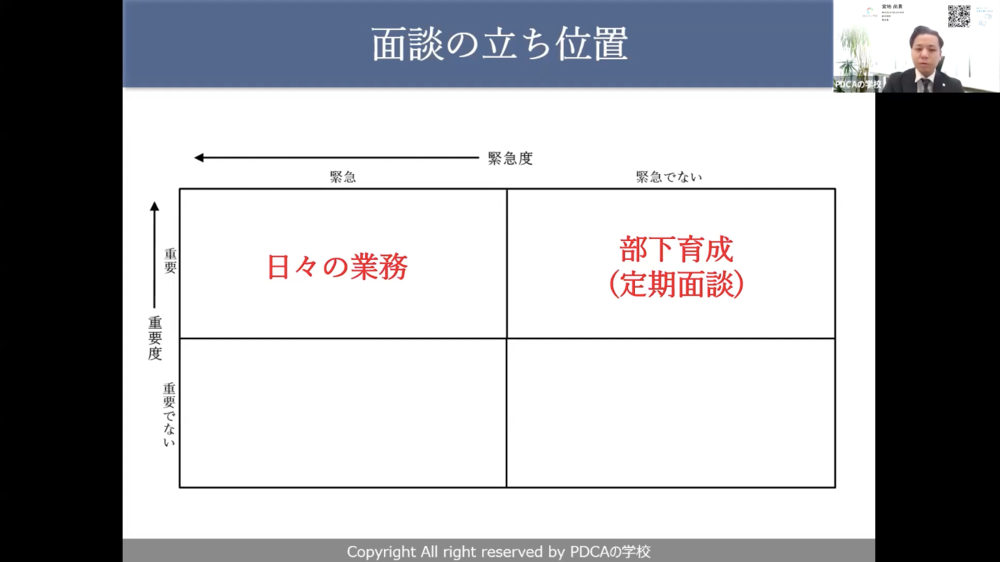 ただ、1日の中で「重要だが緊急でない部分」をとにかく10分でも15分でもやっていかないと、仕事の質や忙しさの質が変わっていかない。部下が育たなかったり工夫が生まれていかないので、重要だが緊急でない部分に着手をしていくことが、管理職側の課題にもなってくるのかなと思っています。