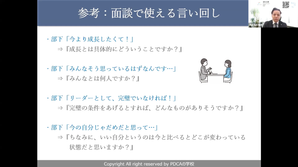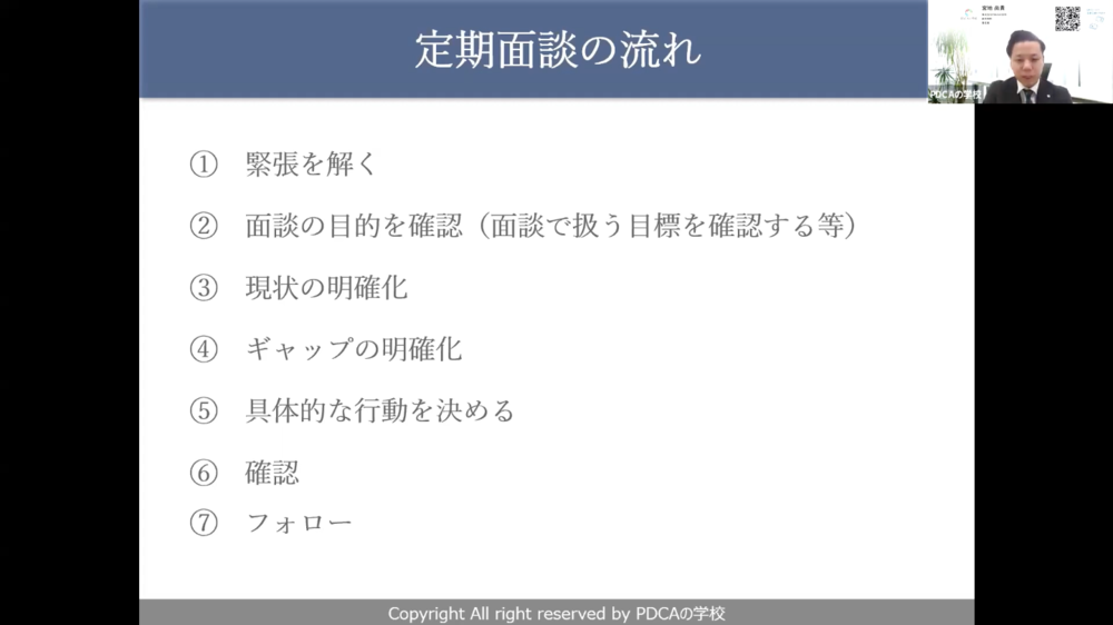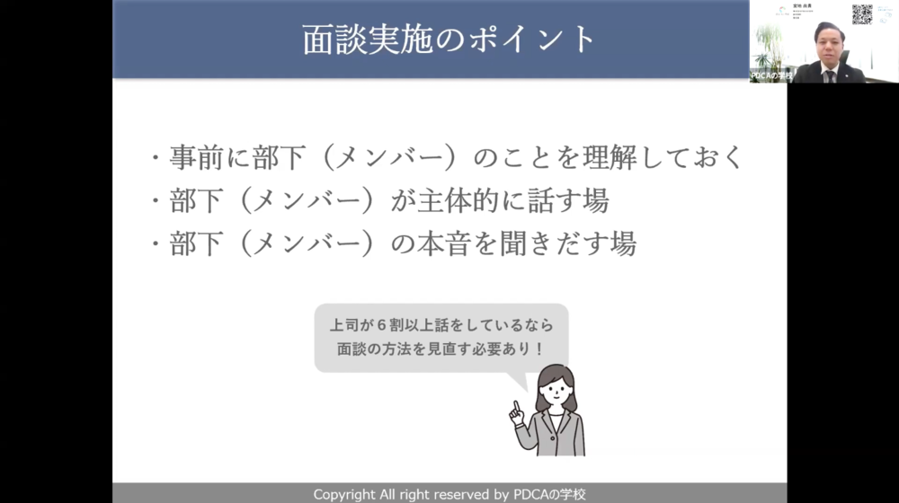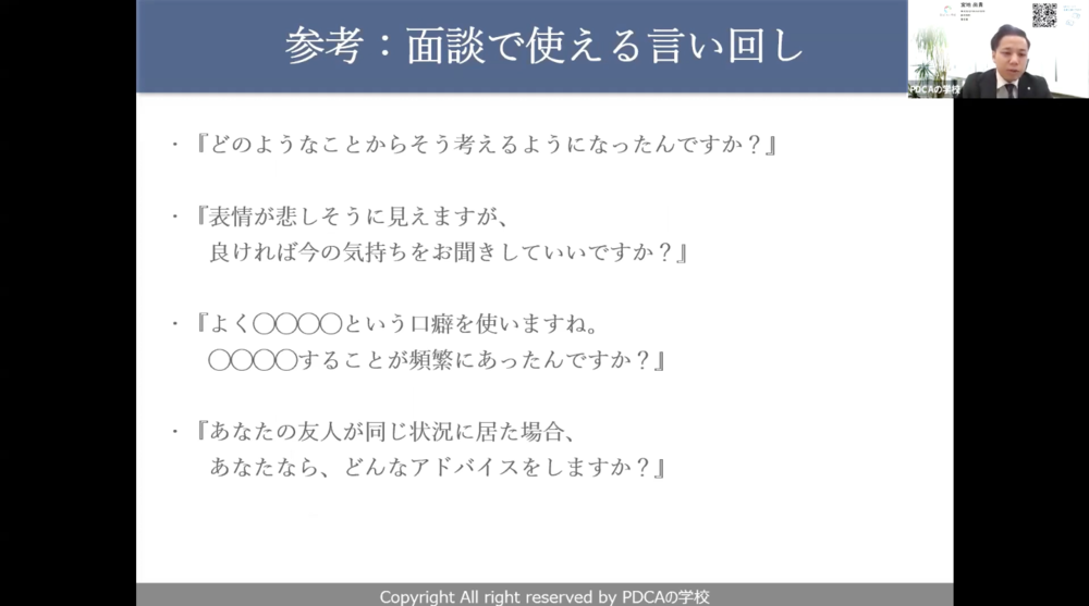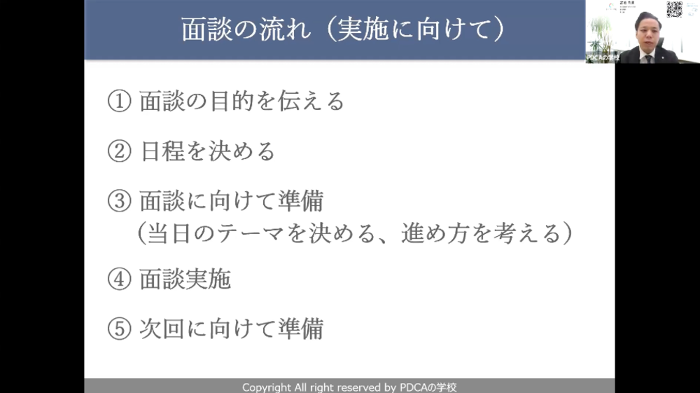 4つ目(面談実施)については、まずは話しやすい雰囲気作りを心がけていただきたいなと思っています。ヒアリングに終始するとか、最近の状況を聞いて否定をするのではなくて、共感をしながら反応していく。