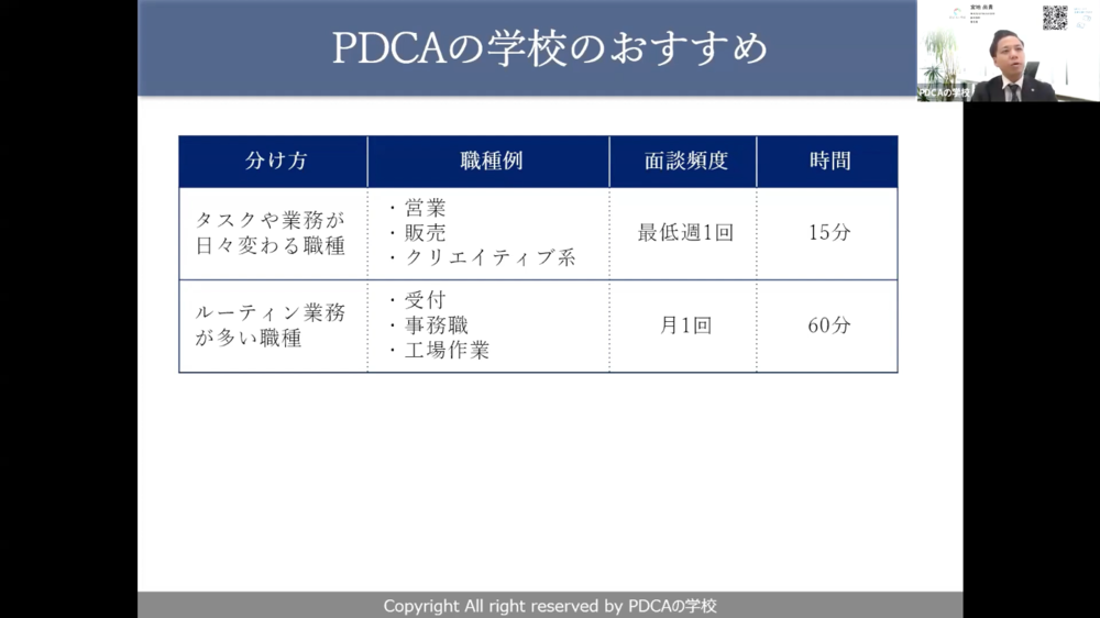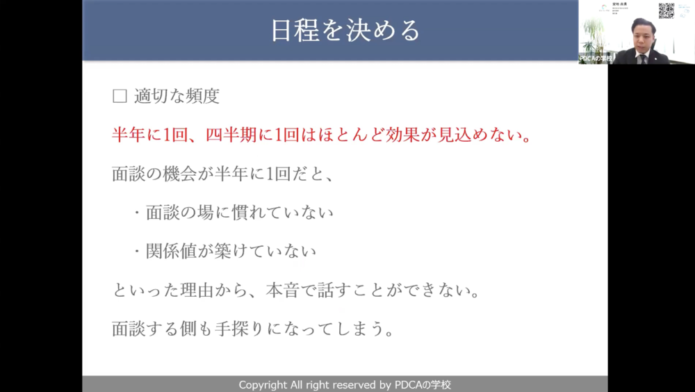 日程を調整する際に、半年に1回や四半期に1回だとほとんど効果が見られませんので、月1回ないし理想は週1回ぐらいを目途にぜひやっていただきたいなと思っています。