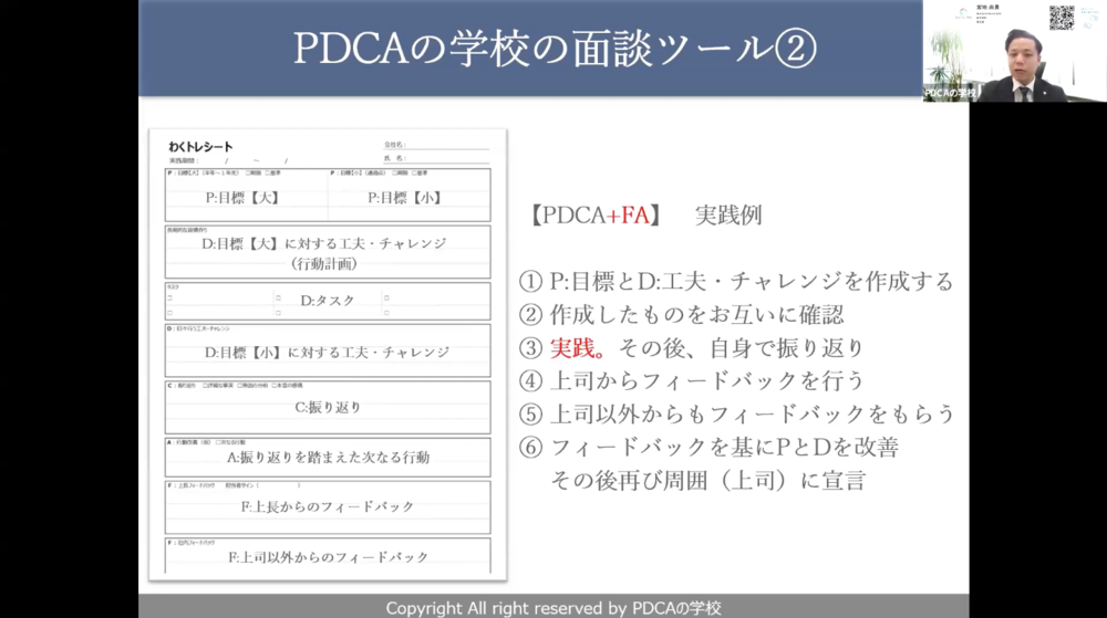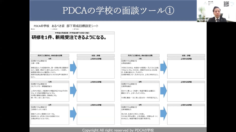 上から2行目と4行目が「日々何をするのか」という部分で、必ず週次で上司がフィードバックをしていく。フィードバック面談にもなるので、だいたいフィードバックの打ち込みをして、これに対する面談を10〜15分やっていくというのが定例化されております。