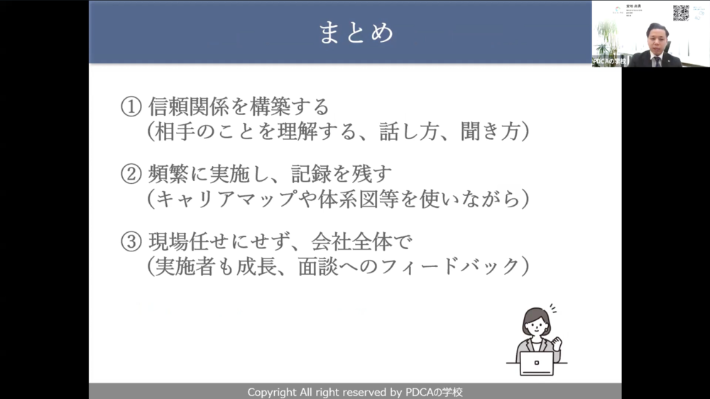 ということで、ここ(スライド)に書いている情報も書いていない情報もお伝えをさせていただきました。面談のまとめで言いますと、まずは前提として、信頼関係を構築していくための相手への理解。もしくは、相手にも理解してもらうという意味では相互理解。話し方、聞き方という部分は、前提として気にかけていただければなと思っています。