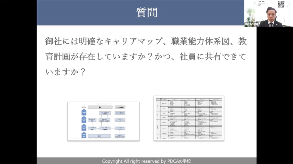最初の面談の時は、ぜひ事前にこうやってキャリアマップも作って(部下に)見せてほしいなと思っています。明確なキャリアマップ、職業能力体系図、教育計画は存在しておりますでしょうか?