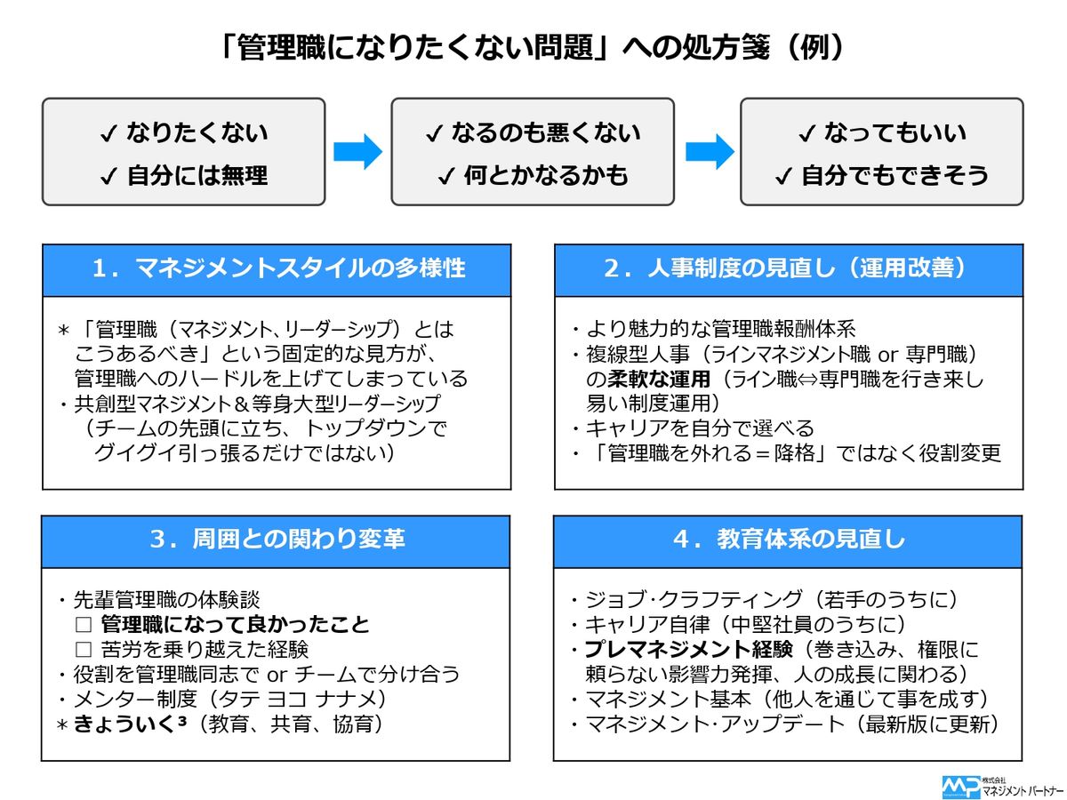 これをなんとか阻止しないといけないですよね。それが今回のメインのお話でございますが、「管理職になりたくない問題」への処方箋。処方箋といっても、ちょっと処方したからといってコロッと良くなるっていうもんじゃないですよね(笑)。