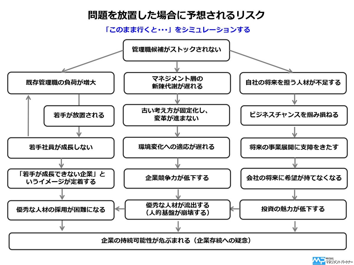 ますます既存管理職の負荷が上がります。増大していきます。ましてや将来を担う人材が不足していきます。(スライドを示して)上の段から下の段の流れが徐々に進むんです。