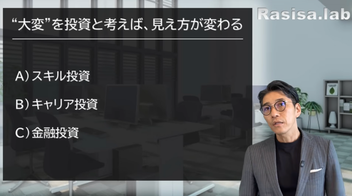 いきましょう、ドンッ。まず「大変」というのを「投資」と考えれば見方が変わります。例えば投資活動。スキルをアップするため、キャリアの選択肢を広げるため。あと、お金で困らないため。そう考えると、「大変」というのが「何かを得たいため」に変わると「投資」になるんですよね。
