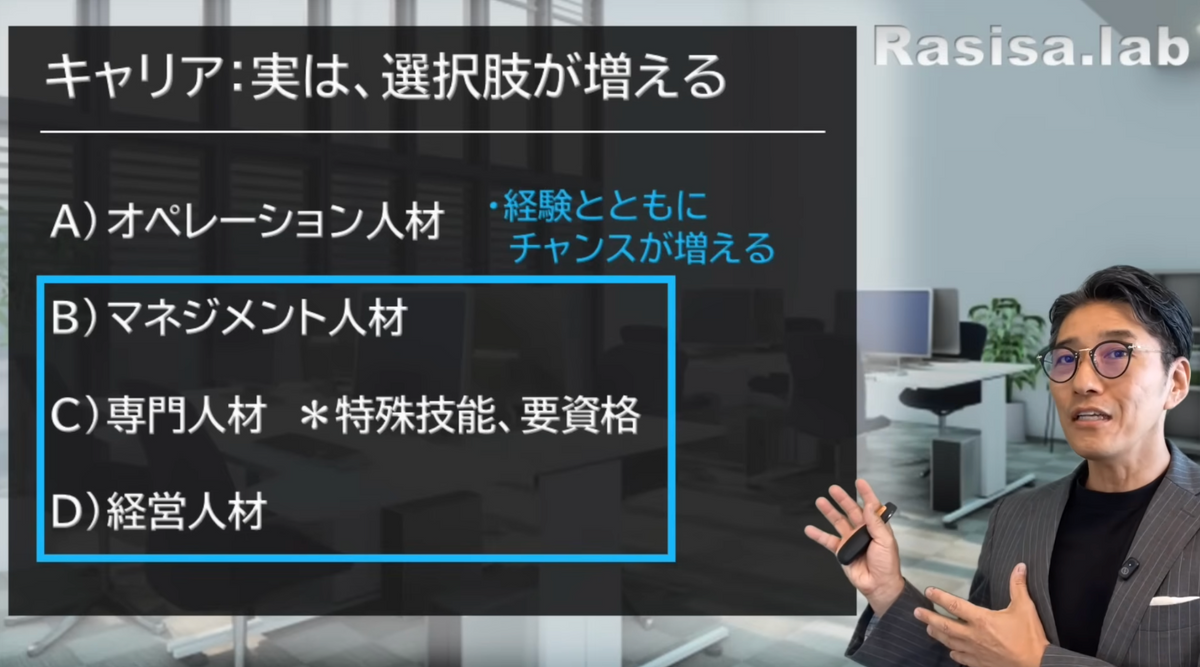 マネジメント人材、もしくは経営人材をやっているとチャンスは広がり、もっと言うといつでもオペレーション人材になれます。誰でもなれるんですよ。逆はなれませんけどね。そういったことを考えた場合に「35歳以降、差がつきます」という話をしています。