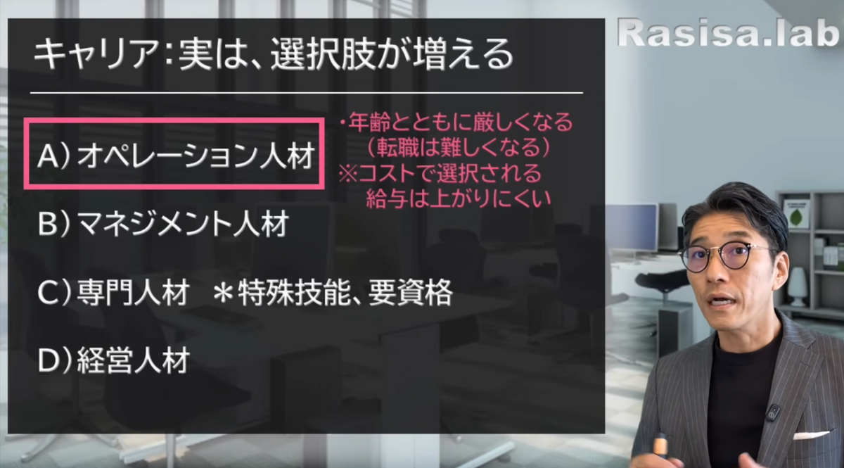 その中で、ドンッ。この「オペレーション人材」というカテゴリーにはリスクがあるんですよ。年齢と共に厳しくなるということが現実にあります。