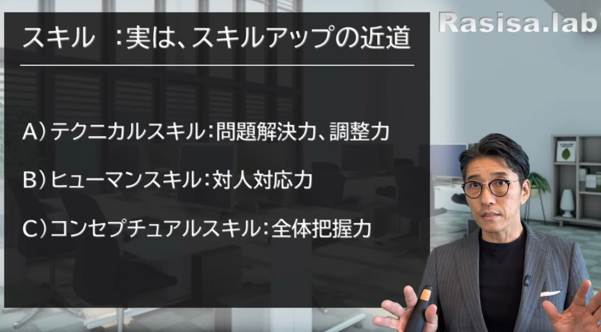 ドンッ。まず「スキル」です。実は(管理職は)スキルアップの最高の近道なんです。管理職になるとわかることがありますが、これはプレイヤーの時はわかりません。
