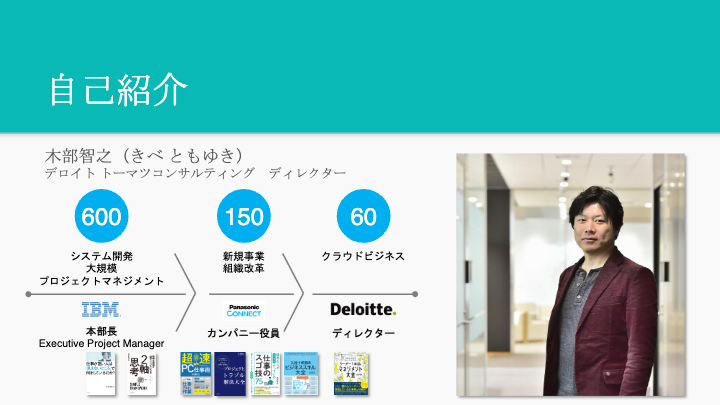 今デロイトトーマツコンサルティングという会社で仕事をしています。3社目で、大学出て最初にIBMという会社に入社しました。(スライドを示して)ちなみにこの丸の中に書いてある数字は、これまで私がこの環境の中でマックスでマネジメントした人数です。
