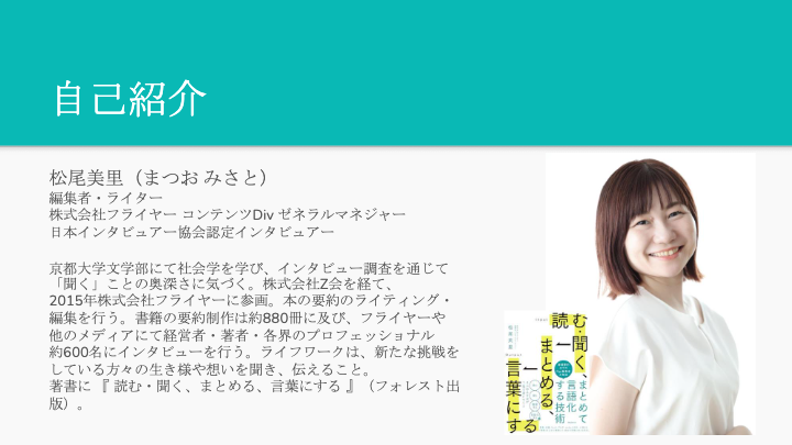松尾美里氏(以下、松尾):本の要約サービス「flier」(フライヤー)で本の要約を制作したり、インタビューをしています、松尾美里と申します。今日はこんな本に囲まれてリラックスできそうな場所で、私自身もすごく助けられた本の著者にインタビューできるというありがたい機会に恵まれて、本当に感激しています。