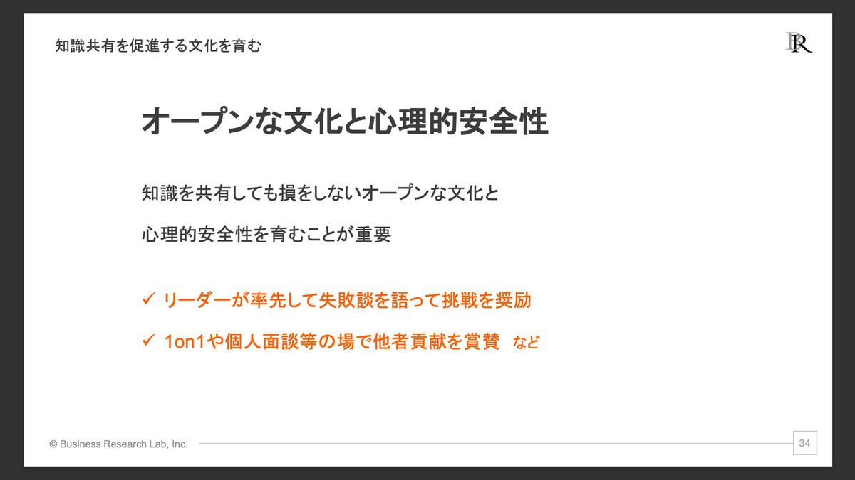 リーダーが率先して失敗談を語ることも有効ですし、1on1や面談の場で「他者に貢献した」「知識を共有した」行為をきちんと称える、といったきめ細かな対応も効いてきます。こうした積み重ねでオープンな空気を育てることが、結局いちばんの近道なのです。