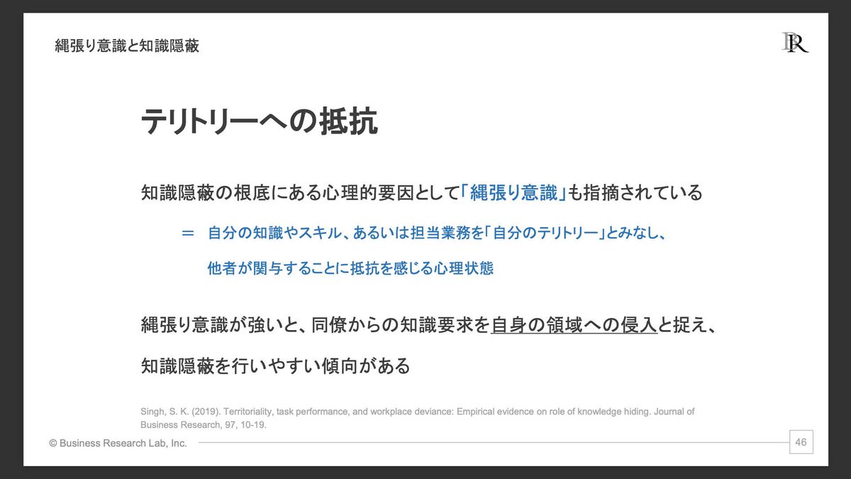 なぜこうしたことが生じるのかを、少し整理します。まず縄張り意識が芽生えると、それが知識隠蔽につながります。知識を隠した経験は「これくらい不誠実でもいいだろう」と心理的ハードルを下げ、規則違反など別の望ましくない行動にも波及しやすくなる。流れとしては、縄張り意識から知識隠蔽、そして不誠実な行動の増加、という悪循環が確認されています。