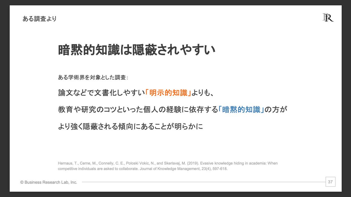 学術界を対象にした調査では、論文のように文書化しやすい明示的知識は比較的シェアされる一方、教育の仕方や研究の勘所といった暗黙的知識は隠蔽されやすいことが確かめられています。