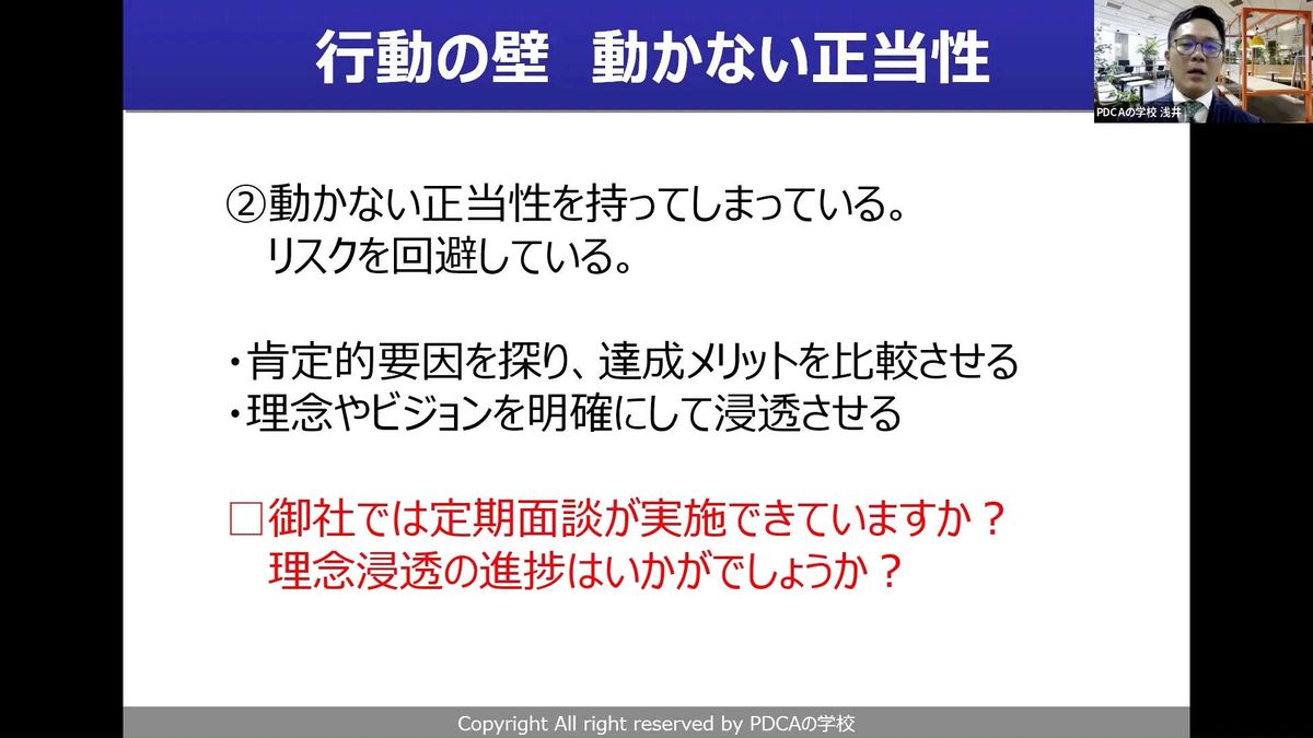 「行動の壁」を打ち破るために考えなければならないのは、動かないことに正当性を持ってしまう管理職が多いという点です。