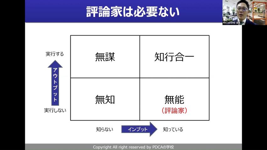 最終的に目指すのは「知っていて行動する」、いわゆる知行合一です。勝海舟の言葉を借りれば、「行わないのなら、知らないのと同じ」。本当の知は実践を伴うべきだということです。